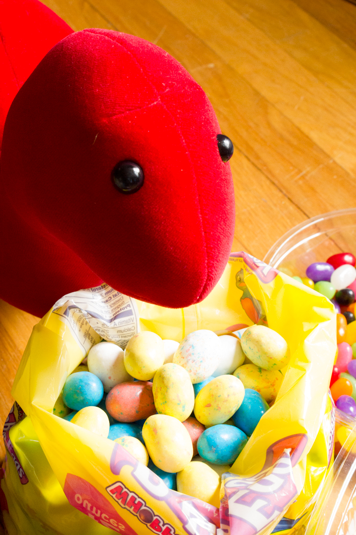 He found the familiar couch. And the big red ball. Kate said his toys were in his box. When Kate's bed was set up, Peep lay down on her pillow and went to sleep. It had been a VERY LONG DAY.